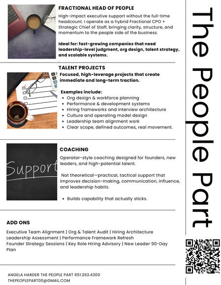 Strategic people leadership without the full-time headcount. I partner with growing organizations as an embedded fractional leader — bringing seasoned VP-level experience to your team while you focus on building the business. This is a true leadership partnership. I’m in it with you.Cost: Monthly retainer