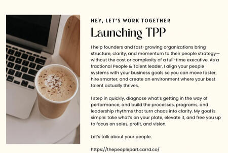When your business is moving fast, the people side can’t be an afterthought.I work with founders and executive teams who are scaling quickly, navigating transformation, or executing on an ambitious growth plan — and need a strategic operator to bring clarity, structure, and momentum to the people side of the business.My work goes beyond traditional HR. I align your leadership, talent, and operations so your organization can grow with intention, not chaos.Let’s talk about the People Part.